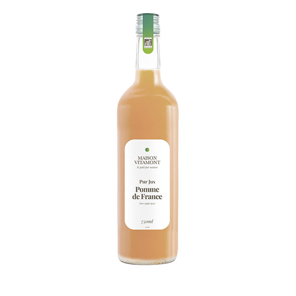 Découvrez la nouveauté Pur jus de pomme de France de Maison Vitamont, un jus fabriqué a base de fruits 100% bio sans scures ajoutés ni conservateurs.