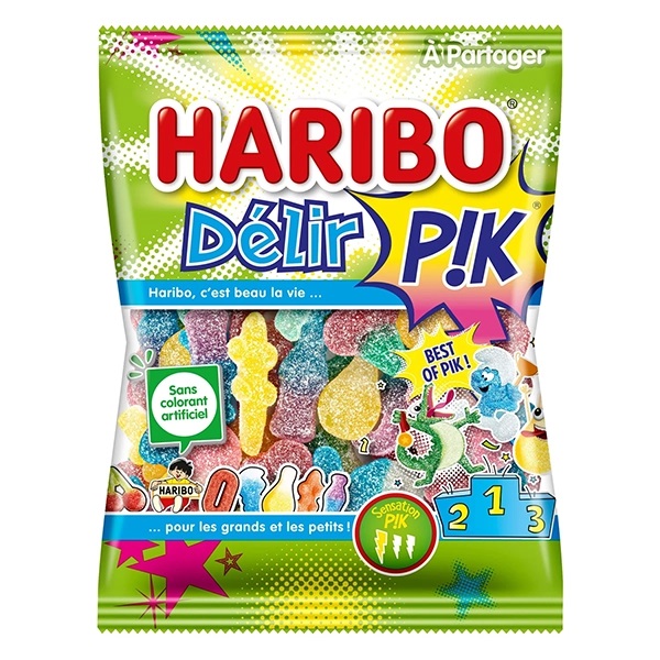HARIBO Delir PIK c'est un mélange de vos bonbons HARIBO PIK préférés dans un même sachet pour encore plus de sensation. Ils sont sans colorant artificiel