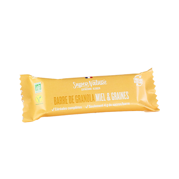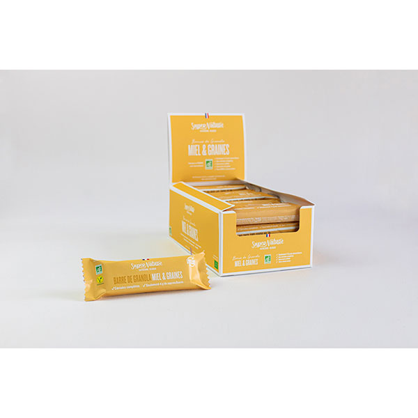 Conditionnement : 1 présentoir de 20 barres granola bio miel et graines