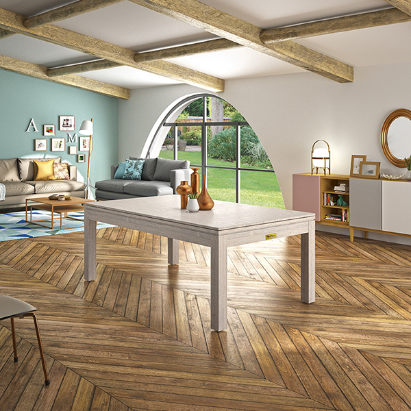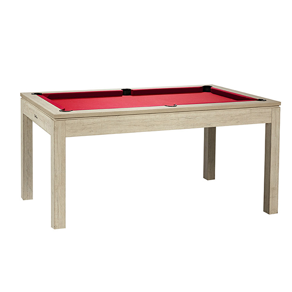 Ce nouveau billard contemporain de couleur gris clair, très tendance, saura se transformer également en table de salle à manger.